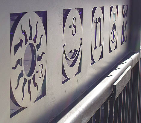 The elements of discovery, history, time and place are articulated by using historical texts, icons, pictographs and the metaphors of "bridge" and "walking" in steel on the railing sections along the span. These designs and texts have been laser cut into stainless steel, backed with a cobalt blue translucent Plexiglas and bolted to the top portion of the railings. The quotations used range from historical figures such as Pythagoras and Lao Tsu to writers and thinkers such as Audre Lorde and Eleanor Roosevelt to important local figures such as Irving Gill and Dr. Suess.